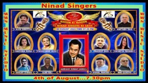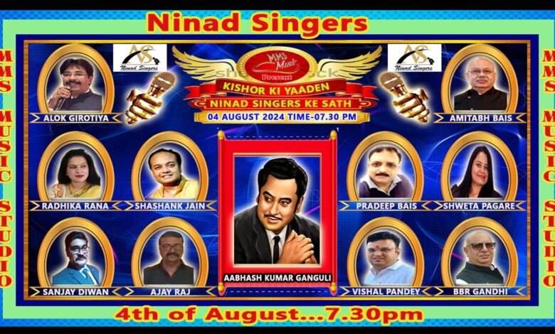 हरफनमौला गायक कलाकार किशोर कुमार के जन्मदिवस 4 अगस्त् को निनाद सिंगर्स एम एम एस म्यूजिक स्टूडियो पर मनायेंगे उनका जन्मदिवस। इस अवसर पर अथ्यक्ष आलोक गिरोटिया ने बताया कि इस बार निनाद सिंगर्स किशोर दा के नगमें एम एम एस स्टूडियो से सायं 7.30 पर लाइव सुनाकर मनोरंजन करेंगे।