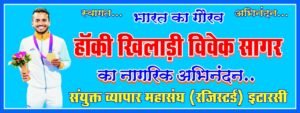 16 अगस्त दिन शुक्रवार को दोपहर 4:00 बजे स्थानीय जयस्तम चौक पर भारत का गौरव राष्ट्रीय हॉकी खिलाड़ी विवेक सागर जी का नागरिक अभिनंदन संयुक्त व्यापार महासंघ की ओर से किया जाएगा आप सभी से करबद्ध निवेदन है समय पर पहुंचकर अपने क्षेत्र के खिलाड़ी का उत्साहवर्धन करें