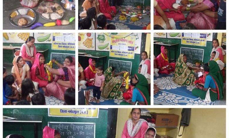 आंगनबाड़ी केंद्र 24 वार्ड 12,केंद्र 69 वार्ड 11 न्यास कॉलोनी झुग्गी इटारसी में परियोजना अधिकारी श्रीमती दीप्ति शुक्ला के निर्देशानुसार पोषण माह के अंतर्गत गोद भराई का कार्यक्रम किया गया है सेक्टर सुपरवाइजर राखी मौर्य ने उपस्थित सभी महिलाओं को पोषण युक्त भोजन की जानकारी दी पोषण युक्त भोजन लेने से शरीर को स्वस्थ बनाए जा सकता है समझाया, केंद्र में उपस्थित महिलाओं ने आंगनबाड़ी केंद्र पर ही संतान सप्तमी व्रत की विधि विधान से पूजन की और प्रसाद प्राप्त भगवान का आशीर्वाद लिया।