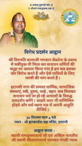 श्री तिरुपति बालाजी भगवान श्री वेंकटेश के प्रसाद में चर्बी युक्त घी मिलाकर सनातन धर्मियों की श्रद्धा पर आघात किया गया है हम सब इसका घोर विरोध करते हैं और ऐसे दोषियों के लिए कठोर से कठोर दंड की मांग करते हैं इसके अंतर्गत आज विश्व हिंदू परिषद बजरंग दल ने कल होने वाले विरोध प्रदर्शन के लिए प्रतिष्ठानों पर जाकर सत्य सनातन धर्मियों का आवाहन किया। हम स्वामी श्री रामकृष्णाचार्य जी के आवाहन पर हम सभी विश्व हिंदू परिषद बजरंग दल समर्थन करते हैं