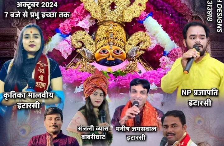 आयोजित किया जा रहा है जिसमें इटारसी की सुप्रसिद्ध श्याम भजन गायिका कृतिका मालवीय, श्याम जगत के सुप्रसिद्ध गायक एन.पी.चौधरी, सुप्रसिद्ध भजन गायक मनीष जायसवाल,बाबरी से गायिका अंजलि व्यास, सुप्रसिद्ध गायक बलराम रघुवंशी,सुप्रसिद्ध गायक सुजीत यदुवंशी भेरूंदा, कार्यक्रम में प्रस्तुति देंगे और अपने सुमधुर भजनों से बाबा के दरबार में हाजिरी लगाएंगे