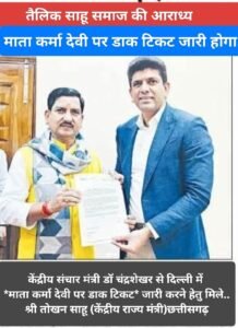 अखिल भारतीय तैलिक साहू महासभा नई दिल्ली के राष्ट्रीय अध्यक्ष श्री जयदत्त क्षीरसागर की मांग पर समाज की आराध्य माता कर्मा देवी पर एक पखवाड़े में डाक टिकट जारी किए जाने का ऐलान केंद्रीय संचार मंत्री डॉक्टर चंद्रशेखर ने किया है उक्त आशय की जानकारी राष्ट्रीय प्रभारी लीगल सेल और प्रदेश मुख्य सलाहकार रमेश के साहू एडवोकेट ने दी।