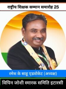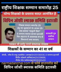 श्री साहू ने बताया कि प्रायोजकों के विशेष सहयोग से आयोजन का यह 41 वा वर्ष है । समिति के संस्थापक संरक्षक श्री प्रमोद पगारे के मार्गदर्शन में आयोजित  राष्ट्रीय शिक्षक सम्मान समारोह हेतु पूरे देश से प्रस्ताव आमंत्रित किए जाते हैं फॉर्म narmadanchal.com से डाउनलोड किया जा सकता है। समिति के सचिव विनीत चौकसे एवं कोषाध्यक्ष नीरज जैन ने बताया कि प्रविष्टियों को ऑनलाइन के साथ-साथ हार्ड कॉपी में निर्धारित प्रारूप और सहपत्रों की फोटोकॉपी के साथ  साहू ला चैंबर  “पांच जनपथ” सराफा बाजार इटारसी पिन – 461111 में 15 अगस्त 2025 के पूर्व विचार हेतु प्राप्त होना आवश्यक है। समिति ने शिक्षकों के प्रस्तावकों से निवेदन किया है कि वह शीघ्र ही योग्य शिक्षकों के प्रस्ताव समय से पूर्व प्रस्तुत करें।