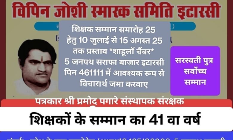 राष्ट्रीय शिक्षक सम्मान समारोह-2025, विपिन जोशी स्मारक समिति का 41 वा आयोजन,15 अगस्त 2025 तक स्वीकार किए जाएंगे प्रस्ताव..