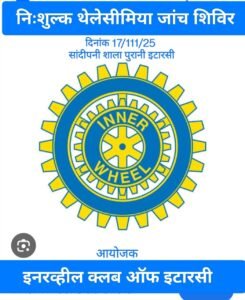 इनर व्हील क्लब ऑफ इटारसी द्वारा निशुल्क थैलेसीमिया की निःशुल्क जांच का कैंप 17 नवंबर को संदीपनी उच्च.मा. शाला पुरानी इटारसी में आयोजित किया गया है उक्त आशय की जानकारी क्लब अध्यक्ष श्रीमती सविता आर साहू ने दी ।श्रीमती साहू ने बताया कि मंडल 304 की अध्यक्ष श्रीमती विभा सिंह के निर्देशन में डॉक्टर माधुरी चौरसिया कोऑर्डिनेटर के रूप में उक्त शिविर को सेवाएं दे रही है जिसमें डॉ खुशबू अग्रवाल और सत्येंद्र सिंह राठौड़ नीमच संरक्षक थैलेसीमिया जन जागरण समिति मध्य प्रदेश एवं अध्यक्ष विशेष रूप से अपना उद्बोधन देंगे । ..