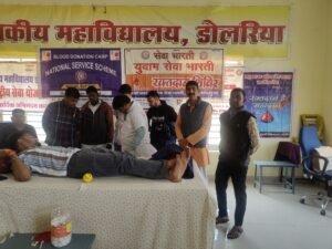 किंतु आज का युवा पीढ़ी मोबाइल,नशा, सट्टा और झूठ बोलने जैसी बुरी आदतों का शिकार हो गई है। हमें युवा साथियों को एकत्रित करना होगा और उन्हें ये बताना होगा कि वे देश की भावी पीढ़ी है। उन्हें याद दिलाना होगा स्वामी विवेकानंद जी के वह वाक्य जो उन्होंने कहे हैं कि उठो,जागो और तब तक मत रुको जब तक तुम अपने लक्ष्य को प्राप्त ना कर लो। इस आयोजित रक्तदान शिविर में महाविद्यालय के प्राचार्य डॉ. आर. के. वर्मा, वरिष्ठ प्राध्यापक डॉ. मोहर सिंह हिंडोलिया, रासेयो इकाई के प्राध्यापक डॉ. विनोद राय, श्रीमती प्रेमलता पाटिल, श्री शैलेंद्र मालवीय, युवाम सेवा भारती नर्मदापुरम जिला संयोजक आशीष भदोरिया जिला पूर्णकालिक देवेंद्र धुर्वे एवं भाजपा डोलरिया मंडल उपाध्यक्ष सत्यनारायण, परिहार,आउटसोर्स कर्मचारी साधना काबरे, राकेश राजपूत रेड क्रॉस सोसाइटी के संयोजक डॉक्टर पंकज साहू एवं विद्यार्थियों ने उत्साहपूर्वक सहभागिता कर 15 यूनिट रक्त का महादान किया। रक्तदान शिविर में युवाओं ने स्वेच्छा से रक्तदान कर मानव सेवा का उत्कृष्ट उदाहरण प्रस्तुत किया। आयोजन के दौरान डॉ श्यामा प्रसाद मुखर्जी शासकीय चिकित्सालय इटारसी दल प्रमुख डॉक्टर शशांक प्रताप सिंह प्रताप सिंह चौहान, लैब टेक्नीशियन मोहन सिंह सोलंकी द्वारा रक्तदाताओं की स्वास्थ्य जांच कर सुरक्षित रूप से रक्त संग्रह किया गया। कार्यक्रम का समापन सभी रक्तदाताओं के प्रति आभार व्यक्त करते हुए किया गया।