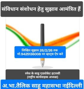 एडवोकेट श्री साहू ने सौंपे गए दायित्व के परिपालन में संविधान संशोधन हेतु 28 फरवरी तक हस्ताक्षरयुक्त लिखित सुझाव व्हाट्स ऐप नंबर 9425136008 पर आमंत्रित किए है।