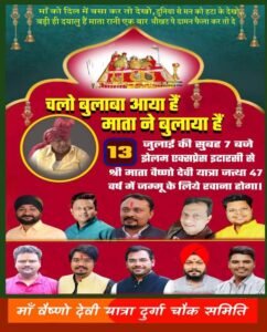 मां वैष्णो देवी यात्रा दुर्गा चौक समिति इटारसी द्वारा माता वैष्णो देवी के दरबार में तीर्थ यात्रियों का जत्था कल 13 जुलाई को प्रातः 7:00 बजे झेलम एक्सप्रेस से जम्मू के लिए रवाना होगा मां वैष्णो देवी तीर्थ यात्रा अपने 47 वे वर्ष में आयोजित की जा रही है जिसमें नर्मदा अंचल, इटारसी और आसपास के क्षेत्रों सहित 300 से भी अधिक श्रद्धालु प्रतिवर्ष यात्रा हेतु जाते हैं.