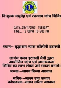 लायंस क्लब इटारसी मैत्री ने रोटरी वृद्धाश्रम अपना घर के सामने स्थित पार्क मे डायबिटीज़ एवं ब्लड प्रेशर चेकअप कैंप लगाया.