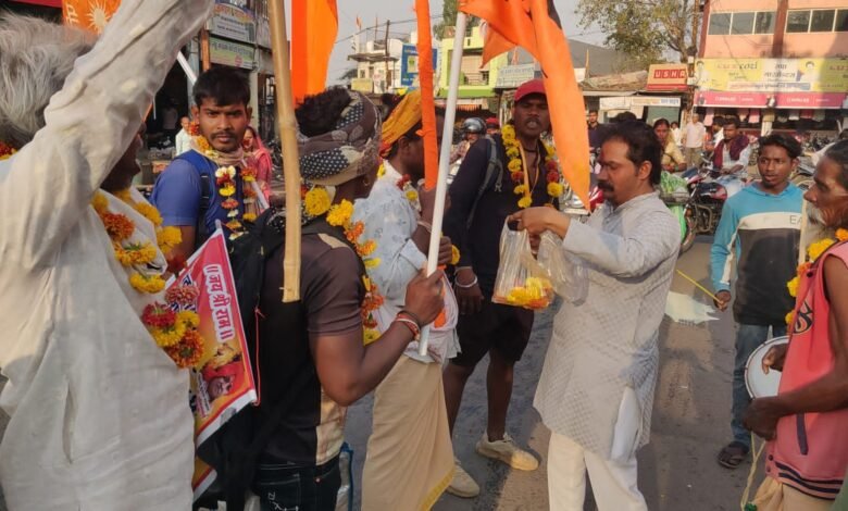 महाराष्ट्र के धारणी से निकले पैदल अयोध्या यात्रा पर जाने बालो का विश्व हिंदू परिषद बजरंग दल ने किया भव्य स्वागत अभिनंदन।