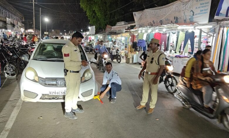 बाजार क्षेत्र की यातायात व्यवस्था को बेहतर बनाने के लिये यातायात पुलिस द्वारा शुक्रवार से चालानी कार्यवाही शुरू की गई है।घण्टे बाजार क्षेत्र की सड़कों पर चार पहिया वाहनों के खिलाफ पुलिस ने चालानी कार्यवाही की है।एसडीओपी महेंद्र सिंह चौहान एवं टीआई गौरव बुंदेला के निर्देश पर यातायात पुलिस प्रभारी सुनील घाबरी ने अपनी टीम के साथ बाजार क्षेत्र की सड़कों पर बेतरतीव ढंग से खड़े चार पहिया वाहनों के खिलाफ चालानी कार्यवाही की गई।पुलिस ने बीती रात 11 वाहन चालकों के खिलाफ बाजार क्षेत्र में चालनी कार्यवाही की पुलिस ने 11 वाहन चालकों से जुर्माने के रूप में 5 हजार रुपये वसूल किये है।यातायात पुलिस की लगातार बाजार क्षेत्र में कार्यवाही जारी रहेगी।