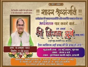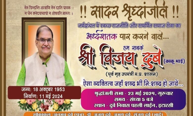 कांग्रेस के वरिष्ठ नेता पूर्व विधायक एवं मध्य प्रदेश शासन में पूर्व गृह उप मंत्री रहे स्वर्गीय विजय दुबे (काकू भाई )की श्रद्धांजलि सभा आज दिनांक 23 मई दिन गुरुवार को शाम 5:00 बजे उनके पहली लाइन स्थित निवास स्थान पर आयोजित की जाएगी.