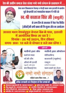 समाज सेवा में अग्रणी नमो नमो संगठन तत्वाधान में 26 मेंई को विशाल मेगा नेत्र शिविर का आयोजन किया गया है। यह शिविर पूर्व केंद्रीय मंत्री सरताज सिंह के जन्मदिन के अवसर पर आयोजित किया जा रहा है। स्वर्गीय सरताज सिंह अपने जीवन में इस तरह के स्वास्थ्य सेवाओं से जुड़े रहे यही कारण था कि अटल जी की सरकार में सरताज सिंह को स्वास्थ्य विभाग की जिम्मेदारी दी गई थी।
