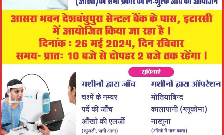 पूर्व केंद्रीय एवं प्रदेश सरकार में मंत्री रहे सरताज सिंह के जन्म दिवस 26 मई को देशबंधुपुरा स्थित आसरा भवन इटारसी में विशाल मेगा नेत्र शिविर का आयोजन किया गया है जिसमें आंख के मरीजों की निशुल्क जांच की जाएगी.