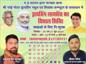 ड्राइविंग लाइसेंस जिसके लिए आवश्यक डॉक्यूमेंट जिन में आधार कार्ड (Adhar Card original) एवं मोबाइल फोन (मोबाइल नंबर वही जो की आधार कार्ड से लिंक हो) लाना अनिवार्य है इस निशुल्क ड्राइविंग लाइसेंस के  विशाल शिविर का शुभारंभ क्षेत्र के लोकप्रिय विधायक डॉ. सीतासरन शर्मा एवं नगर पालिका अध्यक्ष माननीय पंकज चौरे द्वारा किया जाएगा