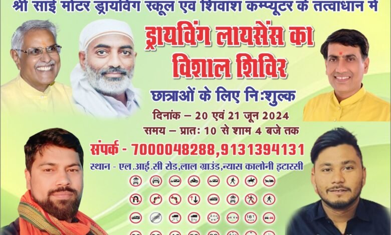 *ड्राइविंग लाइसेंस का विशाल निशुल्क शिविर दिनांक 20 एवं 21 जून 2024 को  प्रातः 10:00 बजे से शाम 4:00 बजे तक आयोजित किया जा रहा है जो की LIC ऑफिस रोड,लाल ग्राउंड,न्यास कॉलोनी इटारसी में आयोजित किया जाएगा.